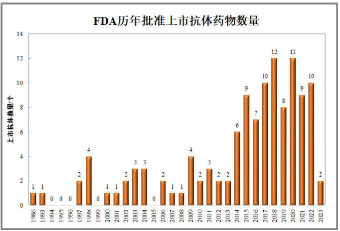 从1986年首款开始,FDA累计批准了120款抗体药物,2022年市场规模达到2200亿美元。