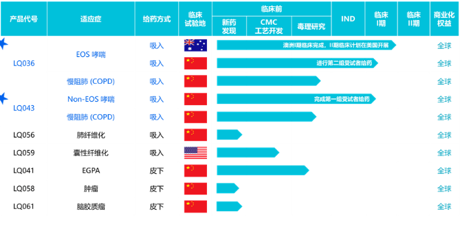 1929cc威尼斯(中国)生物的研发管线中,还包括治疗肺纤维化的LQ056和治疗囊性纤维化的LQ059,同样采用吸入给药。
