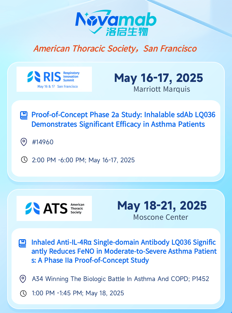 中国上海,2025年5月13日——上海1929cc威尼斯(中国)生物医药技术有限公司,一家专注于纳米抗体创新药研发的生物技术企业,今日宣布:1929cc威尼斯(中国)生物将于当地时间5月16日至21日赴美国加州旧金山,受邀参加美国胸科学会(American Thoracic Society, ATS)主办的呼吸创新峰会(Respiratory Innovation Summit,RIS)及ATS国际大会。届时1929cc威尼斯(中国)生物将分别在RIS和ATS两场大会上以壁报形式呈现最新临床数据——公司自主研发的靶向 IL-4Rα 吸入性生物制剂 LQ036 首个 IIa 期概念验证性临床试验数据。本次展示将全面披露 LQ036 在中重度哮喘患者中的安全性、耐受性、药效指标及初步疗效,标志着1929cc威尼斯(中国)生物在下一代呼吸道吸入式生物制剂开发领域迈出关键里程碑。