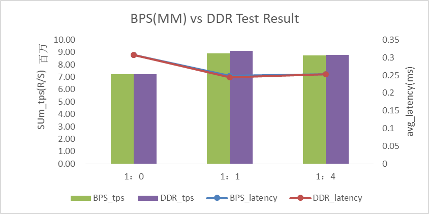 图4:DRAM vs BPS(8+4)不同读写比例Redis测试结果对比
