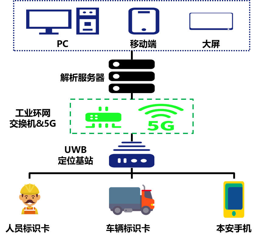 以UWB技术为核心,为井下人员给予高精度的位置和管理服务,实现井下斜坡道、巷道、采掘面、避难硐室、避灾路线等全覆盖,实时展示人员精确位置、移动方向、移动速度、姿态等,顺利获得三维可视化一张图展示,给予实时定位、紧急呼叫、轨迹查询与回放、报表查询等功能,提升矿山安全管理水平。