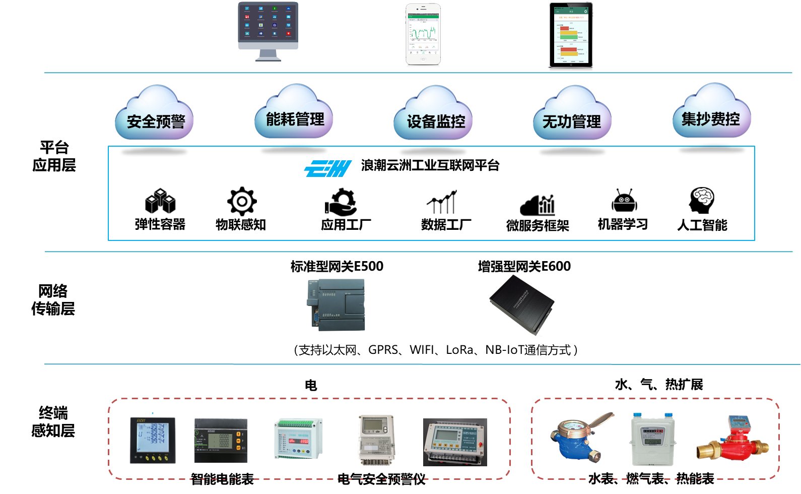 智慧能源管理业务主要包括如下类别:安全预警、能耗管理、设备监控、集抄费控,图为业务架构 终端感知层给予主要是现场的水表、燃气表、热能表,以及安装在现场的智能电表、电气安全预警仪等 网络传输层主要是指给予工业网关,负责终端智能表计与平台应用层的连接,实时采集设备数据,上报到云上的物联网服务 平台应用层基于金数据云洲工业互联网平台搭建,给予面向能源管理领域的特定场景应用。平台给予虚拟化、物联感知、应用工厂、数据工厂、微服务、机器学习、人工智能等服务能力,支撑智慧能源管理应用 应用层给予安全预警、能耗管理、设备监控、无功管理、集抄费控等功能,服务安全用能、经济用能以及精细化管理的需求,同时支持PC端和移动端(IOS、Android)访问,满足不同用户群体使用需求