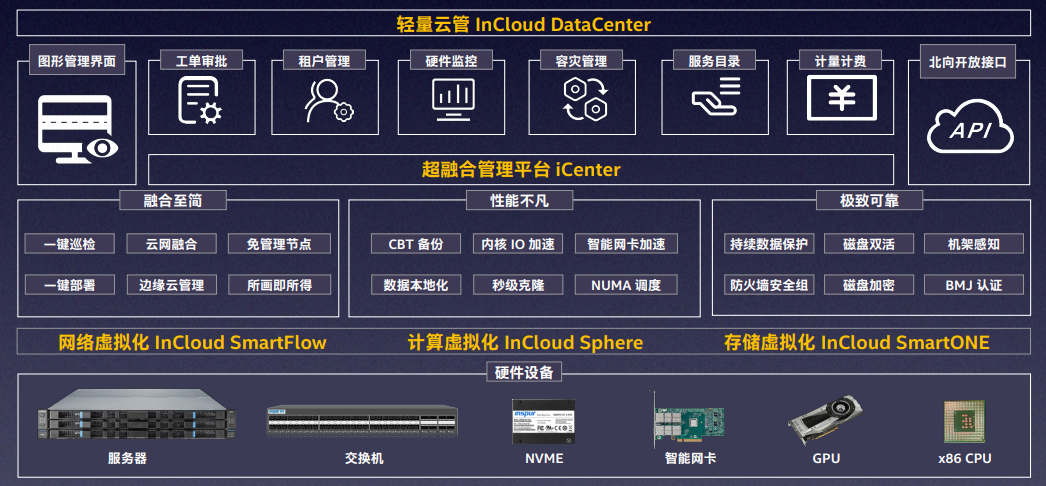 • 集成于超融合一体机中,能够顺利获得一体机所预置的虚拟化平台、云管理平台、快速部署工具以及相关的工作流程,显著简化部署、管理和运维工作的复杂性。