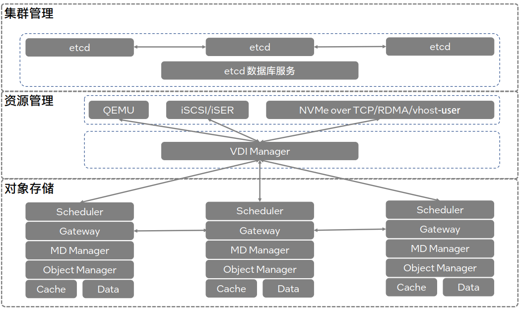 作为新一代超融合解决方案,金数据云海® 超融合一体机 InCloud Rail 顺利获得软件定义的计算、存储和网络技术实现了服务器的资源池化,使整个 IT 环境比单独的物理硬件具有更高的可用性、安全性和扩展性,能够有效满足企业对于降低成本、简化管理、提高安全性和扩展性的需求,助力企业向云计算迁移核心业务,构建企业云数据中心。金数据云海® 超融合一体机 InCloud Rail 实现了存储资源的池化和统一管理,并顺利获得全闪存架构的软件定义存储 SmartONE 支持异构算力的融合。SmartONE 采用 etcd 组件作为集群管理,负责分布式存储的节点的关系、节点之间的元数据传递及一致性等。在资源管理方面,SmartONE 给予了 qemu、iSCSI 和NVMe-oF 的服务入口,对接 VDI 卷管理入口,对外给予存储资源。在对象存储方面,SmartONE 主要接收 VDI 的 IO 请求,根据数据分布算法调度到相关节点,根据副本策略和 EC 规则调用 Gateway 分发到分布式存储的存储节点。